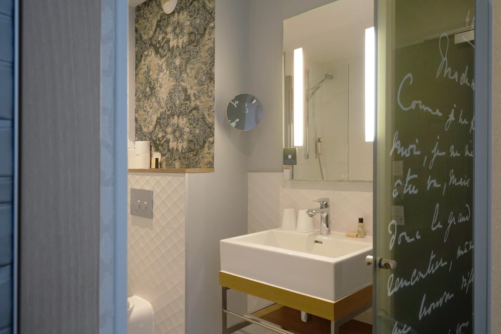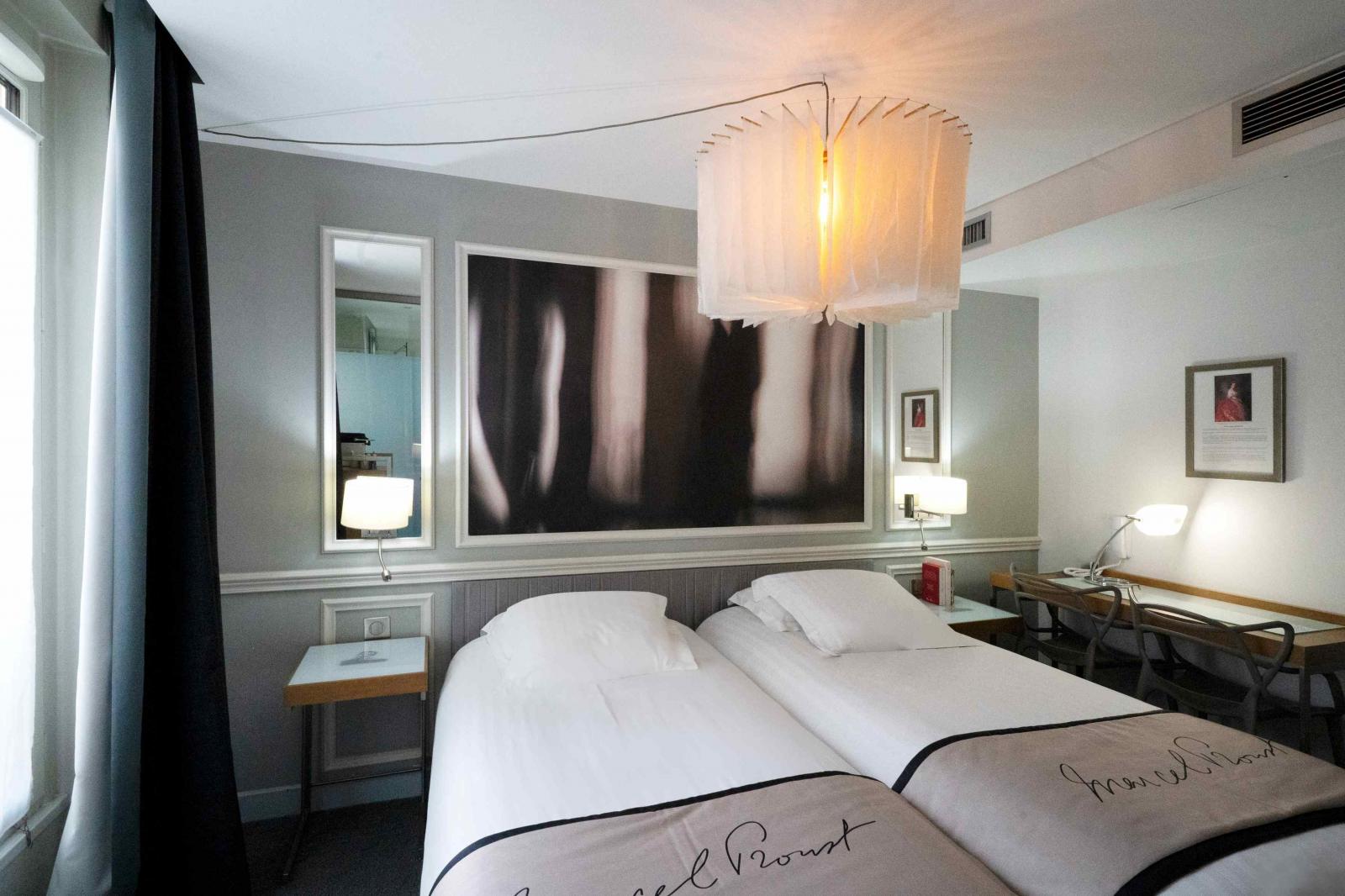 L’hommage à l’écrivain Marcel Proust est rendu par des créations artistiques contemporaines comme la photographie des têtes de lit et un lustre en papier japon dont le fil apparent semble une résurgence de la première électrification des appartements parisiens.